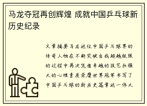 文章摘要:马龙,这位中国乒乓球界的传奇人...