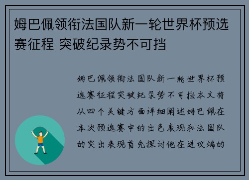 姆巴佩领衔法国队新一轮世界杯预选赛征程,...