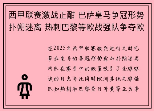 在2025年西甲联赛激烈进行之时,巴萨和...