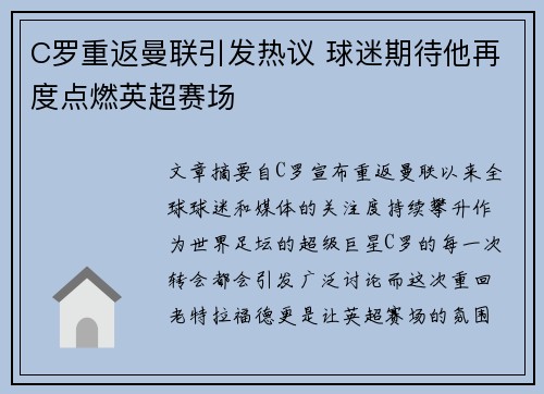文章摘要:自C罗宣布重返曼联以来,全球球...
