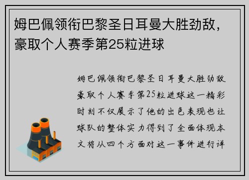 姆巴佩领衔巴黎圣日耳曼大胜劲敌,豪取个人...