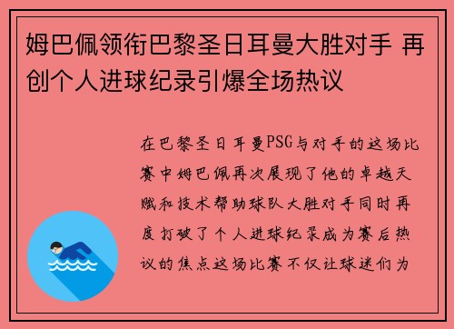 在巴黎圣日耳曼(PSG)与对手的这场比赛...