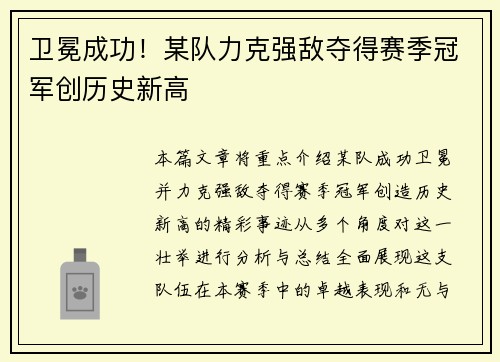 本篇文章将重点介绍某队成功卫冕并力克强敌...