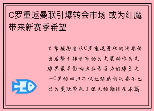 文章摘要:自从C罗重返曼联的消息传出后,...