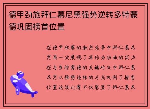 在德甲联赛的激烈竞争中,拜仁慕尼黑再一次...