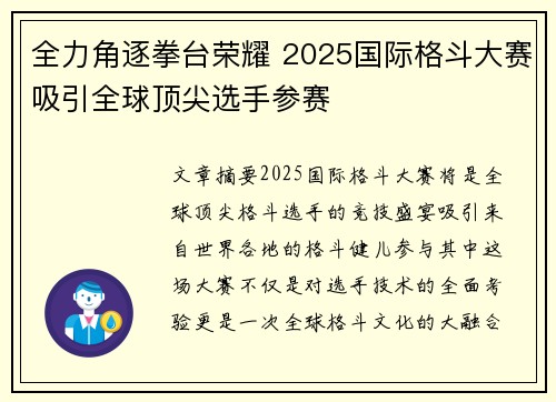 文章摘要:2025国际格斗大赛将是全球顶...