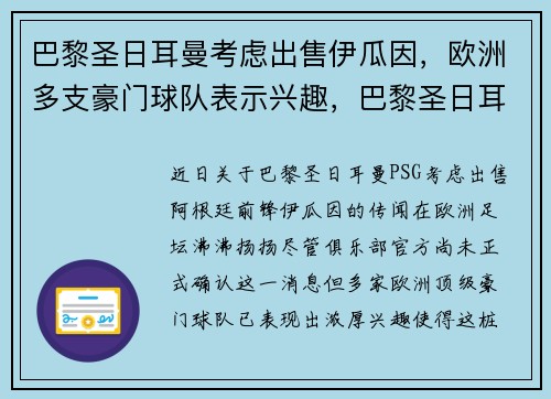近日,关于巴黎圣日耳曼(PSG)考虑出售...